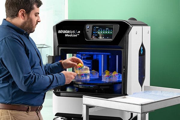 - Con múltiples materiales y capacidades multicolores, los centros médicos académicos, hospitales y empresas de dispositivos médicos pueden crear con impresión 3D modelos de planificación prequirúrgica brillantemente vívidos, modelos de educación y capacitación, modelos de desarrollo de dispositivos médicos y guías de perforación y corte que son esterilizables y biocompatibles, todo en un sistema certificado.