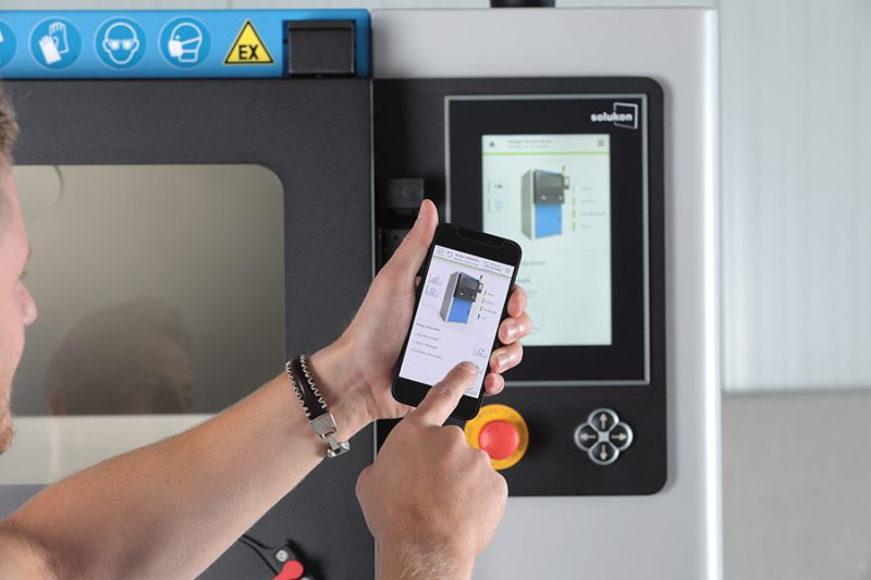 Dado que el SFM‑AT350 no tiene fuente de ignición, también limpia de forma segura los componentes hechos de materiales reactivos como el aluminio o el titanio. La inertización con control de seguridad con gas inerte proporciona una protección adicional contra explosiones. Una interfaz OPC UA convierte al SFM‑AT350 en el caballo de batalla inteligente para su posprocesamiento. Además, puede monitorear el proceso de eliminación de polvo a través de un teléfono inteligente en cualquier momento. La herramienta opcional Digital Factory permite la integración de automatización y control de calidad para su proceso de eliminación de polvo.